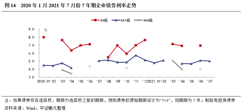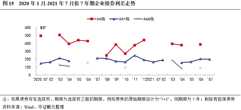 從趨勢看,7年期除權無擔保企業債,7月份AA+級利率利差微幅下調,其他級別未發行。