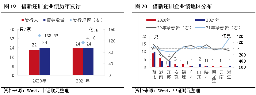 從地區分布看,借新還舊企業債主要分布在湖北,發行數量占比分別為40%,除湖北外,湖南、江蘇兩省發行數量次之,但2020年和2021年企業債凈融資為負,地區存續主體再融資壓力較大。整體看,借新還舊企業債發行主體主要位于再融資壓力加大的省份,多為企業債發行規模較大的地區。