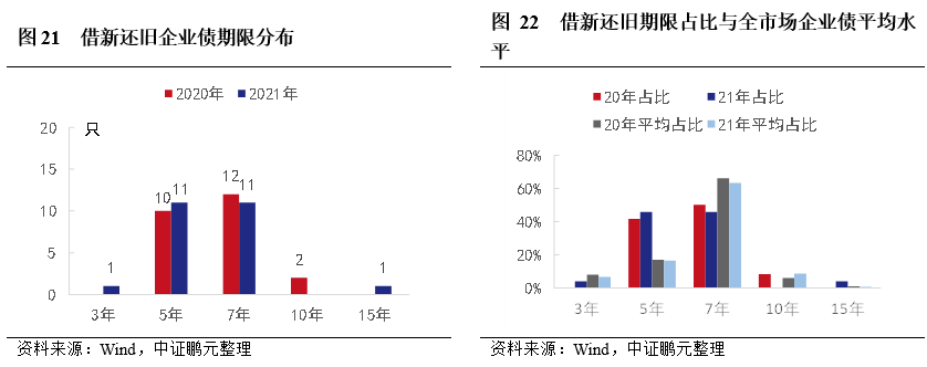 從期限分布看,借新還舊企業債主要為5年期和7年期品種,發行數量占比分別為44%和48%,其他期限品種發行較少。與企業債平均期限比,借新還舊企業債中5年期品種明顯較高,7年期品種相對較少。