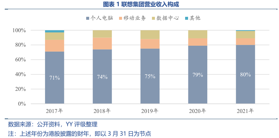 此次申請上市的為港股上市公司聯(lián)想集團(tuán),而非境內(nèi)發(fā)債主體聯(lián)想控股。聯(lián)想集團(tuán)的業(yè)務(wù)由個(gè)人電腦業(yè)務(wù)、移動(dòng)業(yè)務(wù)(主要是智能手機(jī))、數(shù)據(jù)中心三大板塊構(gòu)成。其中個(gè)人電腦業(yè)務(wù)仍然是營收的主要來源,營收占比達(dá)到70%-80%附近,而科技含量相對較高的數(shù)據(jù)中心業(yè)務(wù)僅占比10%左右。