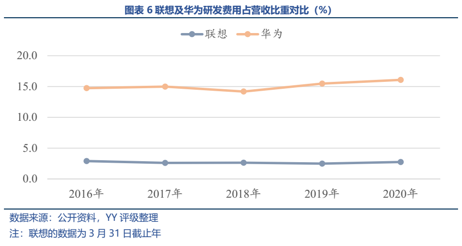 聯(lián)想的研發(fā)費(fèi)用占營收比重與華為等專精技術(shù)的企業(yè)形成了鮮明對比,聯(lián)想的研發(fā)費(fèi)用占比僅在2%-3%之間,而華為的研發(fā)費(fèi)用占比持續(xù)在14%以上,而2020年科創(chuàng)板企業(yè)研發(fā)費(fèi)用占比的中位數(shù)也達(dá)到8%。