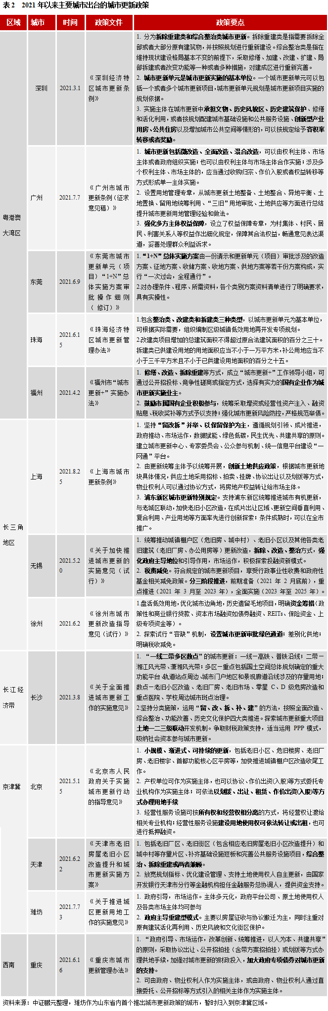 1.國家層面政策推動,城市更新上升到國家戰略。2021年,城市更新首次被寫入政府工作報告,并列入《十四個五年規劃和2035年遠景目標綱要》,各地積極響應,迅速出臺了一大批城市更新政策和實施計劃。截止目前,據不完全統計,2021年全國絕大多數省市層面均提出城市更新,13個地級城市發布了城市更新相關政策。其中深圳和上海完成了城市更新立法,廣州城市更新立法正在征求意見中。北京、成都、上海、天津、武漢、無錫等地陸續成立或準備組建城市更新公司和基金,在政策帶動下,城市更新發展迅猛。