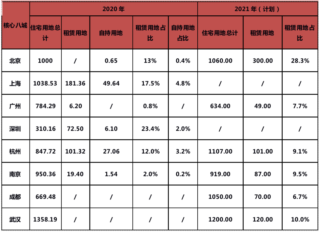 由此看出國家已經(jīng)從政策層面有效保障的租賃用地的供給,而目前已經(jīng)正式公布2021年住宅用地供應(yīng)計(jì)劃的核心六城也的確印證了這一點(diǎn)。