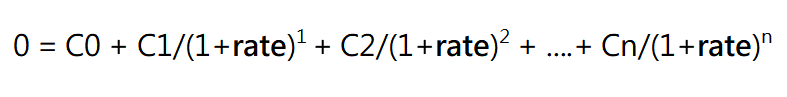 如何反推呢,所用的方法是將每筆現(xiàn)金流量以利率rate折現(xiàn),然后令所有現(xiàn)金流量的凈現(xiàn)值(NPV)等于零。若C0、C1、C2、C3...Cn分別代表為期初到n期的現(xiàn)金流量,正值代表現(xiàn)金流入,負(fù)值代表現(xiàn)金流出。