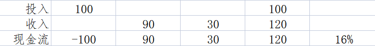 還拿上面的例子來(lái)說(shuō),IRR等于16%,假設(shè),存銀行年利率16%,那么復(fù)利怎么算?存一年116萬(wàn),存兩年134.56萬(wàn)。