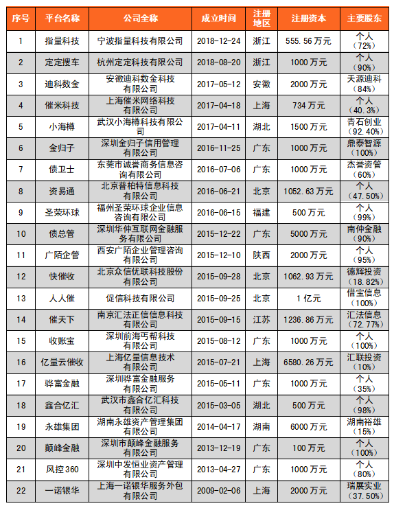 在線催收類平臺約有22個,其中廣東注冊平臺最多,有7個,其次是上海3個,2個區(qū)域合計占比45.5%。永雄集團(tuán)于2018、2019年兩次赴美上市,卻均以失敗告終。