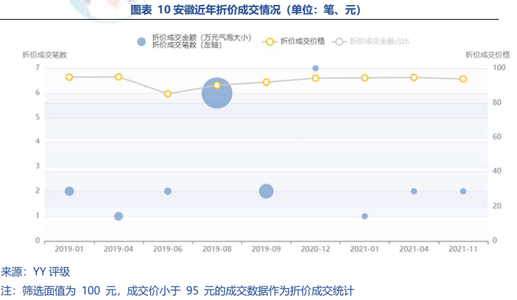 同樣沒有存在感的還有安徽的債務規模。21年存續有息債務總量17,142.29億元與凈融資規模760.43億元,債務壓力與經濟實力相匹配。除18年天長城投擔保違約外,近年也未發生有顯著影響的負面事件,區域內折價成交極少,整體風險可控。對于債市沒有存在感或許是件好事。