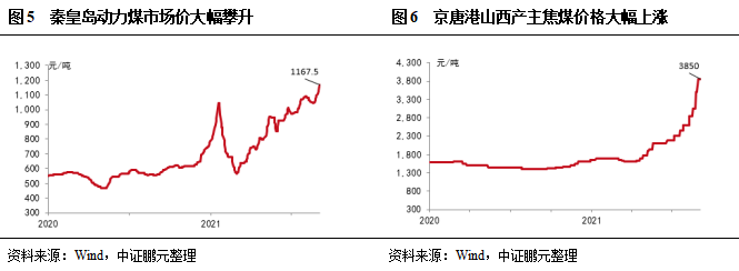 春節(jié)前供給偏緊張,同時寒冬采暖需求旺盛、焦鋼廠保持高開工率,動力煤價格快速上漲,秦皇島動力煤市場價(Q5500K,山西產(chǎn))一度超過1,000元/噸;春節(jié)期間,產(chǎn)地大部分煤礦由于保供任務正常生產(chǎn),同時下游工業(yè)企業(yè)放假,需求減弱,價格下降至2月末的567.5元/噸;3月份以后,下游企業(yè)復工復產(chǎn),需求快速恢復,同時晉陜蒙主產(chǎn)地安全環(huán)保檢查頻繁,供給收緊,動力煤價格開啟上漲。二季度后,安全事故頻發(fā)導致主產(chǎn)區(qū)安檢力度加大,動力煤價格持續(xù)上漲,截至2021年9月初,秦皇島動力煤市場價(Q5500K,山西產(chǎn))攀升至1,167.5元/噸,3月以來漲幅達到105.73%。煉焦煤方面,以京唐港山西產(chǎn)主焦煤為例,由于山西省全環(huán)保檢查頻繁,煉焦煤供給緊張,4月份以后下游鋼鐵需求走強,價格持續(xù)上漲至9月初的3,850元/噸,2021年以來漲幅超過130%。