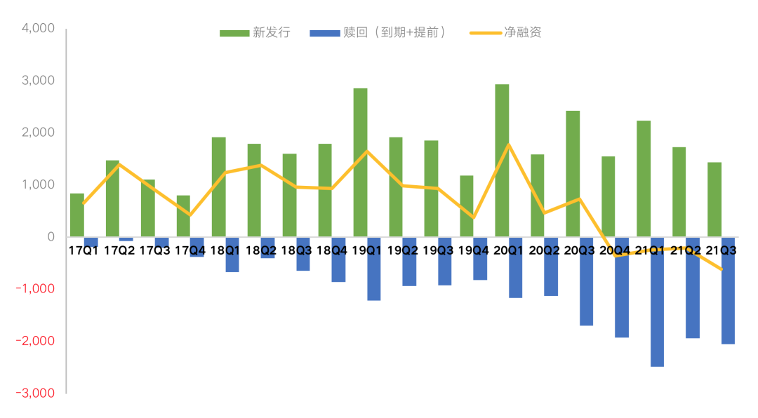 圖:2017Q1-2021Q3樣本房企債券凈融資情況(單位:億元)
