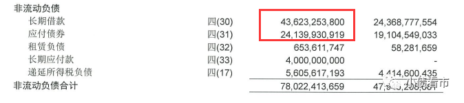 除此之外,新城控股還有780.22億非流動(dòng)負(fù)債,主要為長(zhǎng)期借款和應(yīng)付債券,其長(zhǎng)期有息負(fù)債合計(jì)677.63億元。