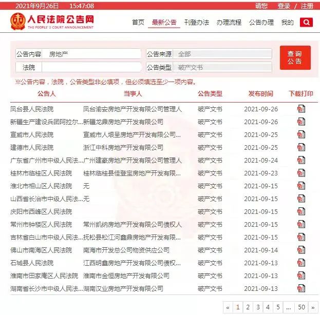 我很不情愿的去翻看了下人民法院公告網,9月26日,2021年走到了第270天,雖然光耀集團還「榜上無名」,沒有在該網站上公示,但卻能看到和光耀集團一樣倒下的房企們,已經達到了300家。
