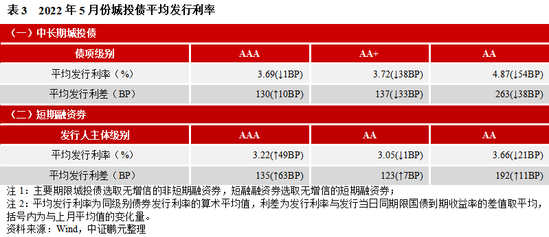 5月份長期限城投債發行利率下行、AA+和AA級平臺利差收窄。5月份,長期限無增信AAA級、AA+級、AA級城投債平均發行利率較上月分別下行1BP、38BP、54BP,利差分別較上月分別擴大10BP、收窄33BP、收窄38BP。