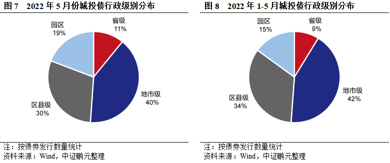 從行政級別分布來看,5月份省級和園區平臺發債數量相對增加,地市級和區縣級平臺債券發行數量占比下降。具體而言,省級平臺發行105只,占比11%,較上月上升1.7個百分點;地市級平臺發行債券126只,占比42%,較上月下降2.8個百分點;區縣級平臺發行債券93只,占比34%,較上月下降3.8個百分點;園區城投發行債券60只,占比15%,較去年上月上升4.8個百分點。