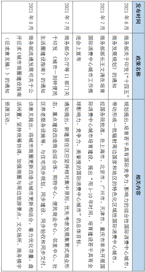 2021年出臺的相關商業政策,主要涉及城市商業發展、商圈改造升級、夜經濟發展等方面,給行業的穩健發展營造了健康環境。