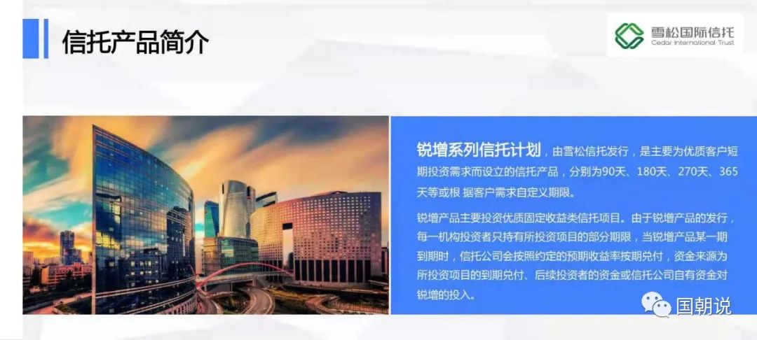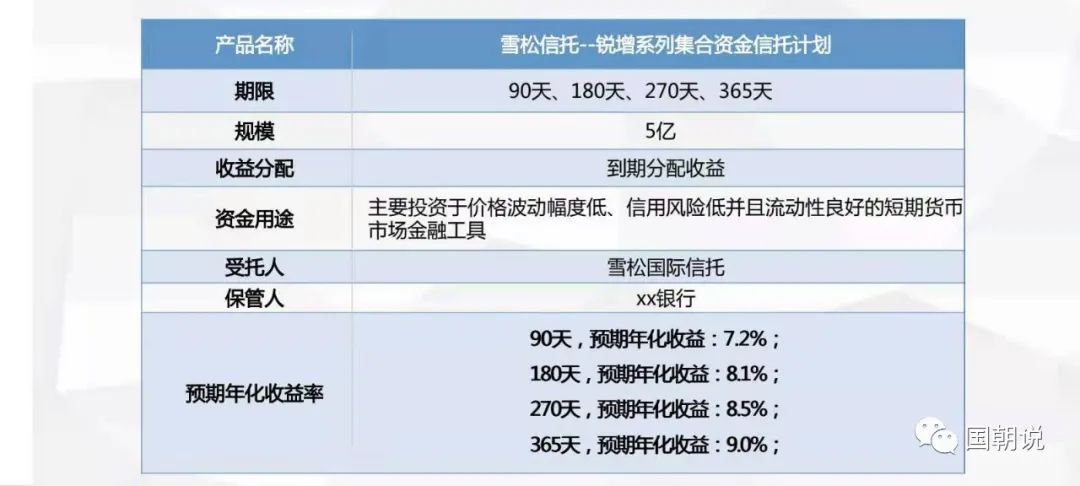 根據(jù)信托公司推介資料顯示,該產(chǎn)品名為銳增系列信托計劃,由雪松信托發(fā)行,是主要為優(yōu)質(zhì)客戶短期投資需求而設(shè)立的信托產(chǎn)品,分別為90天、180天、270天、365天等或根據(jù)客戶需求自定義期限,預(yù)期收益7.2%-9%。