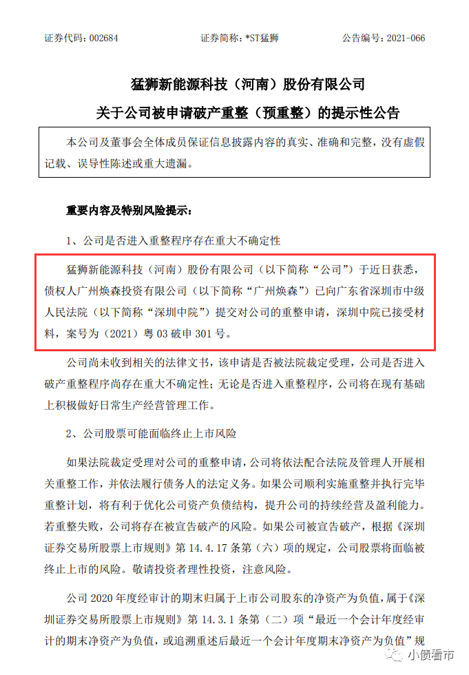 5月9日晚,*ST猛獅(002684.SZ)公告稱,債權人廣州煥森以公司無法履行擔保責任償付債權為由,向深圳中院提交重整申請,深圳中院已接受材料。