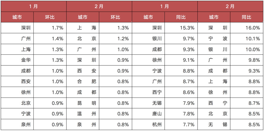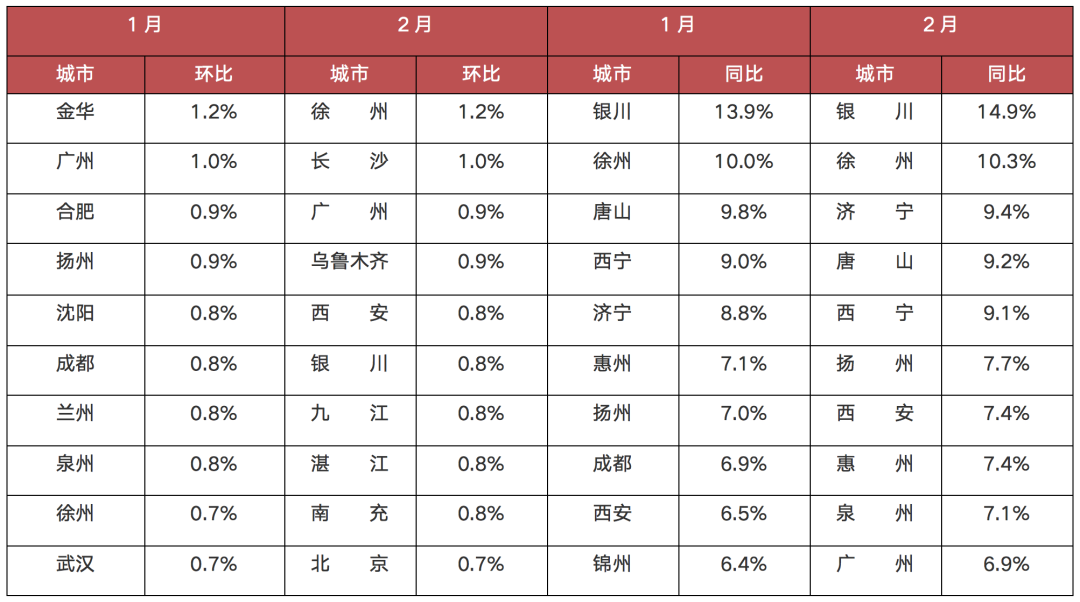 表:2021年1月、2月新房價格同環比漲幅前十城市排行