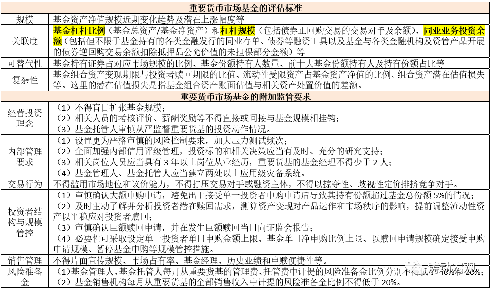 證監(jiān)會和央行對重要貨幣市場基金實(shí)施監(jiān)督管理。除基金的一般性要求外,《征求意見稿》從經(jīng)營投資理念、風(fēng)險管理、人員及系統(tǒng)配置、投資比例、交易行為、規(guī)模控制、申贖管理、銷售行為、風(fēng)險準(zhǔn)備金計(jì)提等方面對重要貨幣市場基金及其基金管理人、托管人和銷售機(jī)構(gòu)提出了附加監(jiān)管要求和風(fēng)險處置要求。