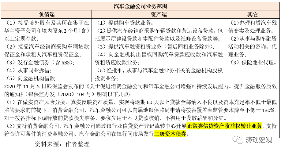 當然,政策層面目前正采取一些舉措改善汽車金融公司的資金來源單一的問題。例如,2020年11月5日銀保監(jiān)會發(fā)布的《關(guān)于促進消費金融公司和汽車金融公司增強可持續(xù)發(fā)展能力、提升金融服務(wù)質(zhì)效的通知》(銀保監(jiān)辦發(fā)(2020)104號)便提出支持消費金融公司、汽車金融公司通過銀行業(yè)信貸資產(chǎn)登記流轉(zhuǎn)中心開展正常類信貸資產(chǎn)收益權(quán)轉(zhuǎn)讓業(yè)務(wù),支持符合許可條件的消費金融公司、汽車金融公司在銀行間市場發(fā)行二級資本債券。