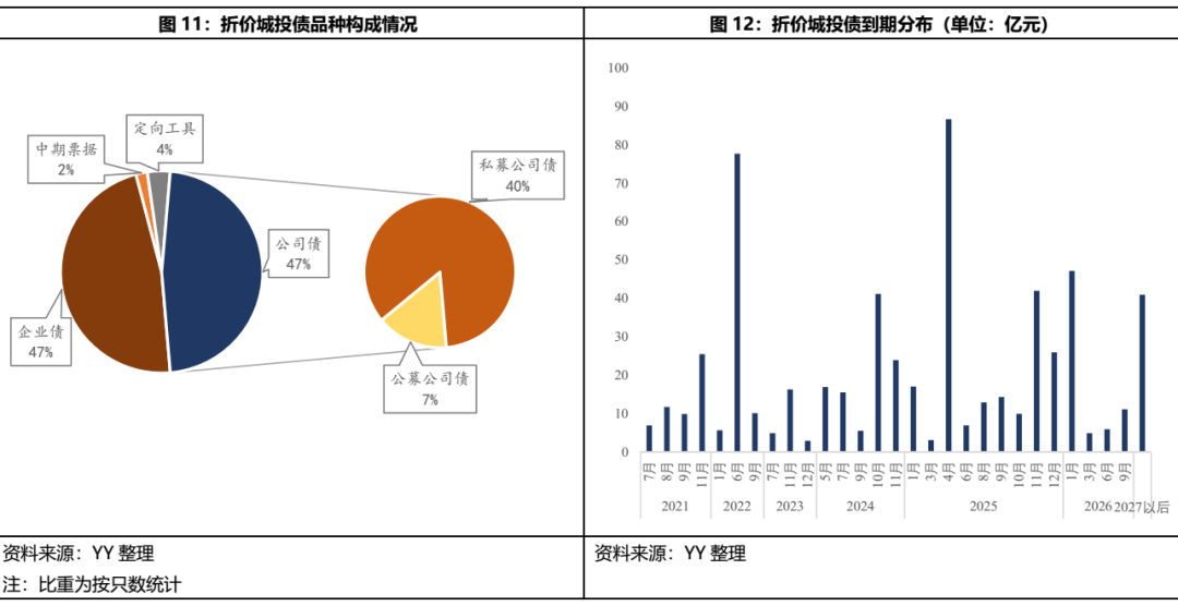 截至2021年4月9日,貴州折價城投債余額605.39億元,不考慮行權的情況下,2021年將到期54.32億元,占8.97%,大多數將在2022年(93.59億)、2024年(103.4億)及2025年(219.32億)集中到期,償債期限結構尚可。