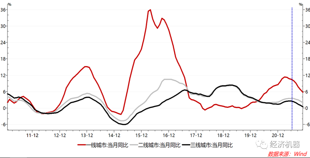 房地產(chǎn)方面,房地產(chǎn)銷售面積當(dāng)月同比增速?gòu)?月底的7.5%,大幅下降至11月份的-14%,房地產(chǎn)行業(yè)幾乎“一夜入冬”。房地產(chǎn)下滑有周期性原因,2015-2020年,房地產(chǎn)行業(yè)呈現(xiàn)復(fù)蘇和分化走勢(shì),行業(yè)自身存在調(diào)整性需求。2021年下半年以來(lái),供需兩端多種因素疊加下,房地產(chǎn)行業(yè)出現(xiàn)了同步的下行(圖1)。