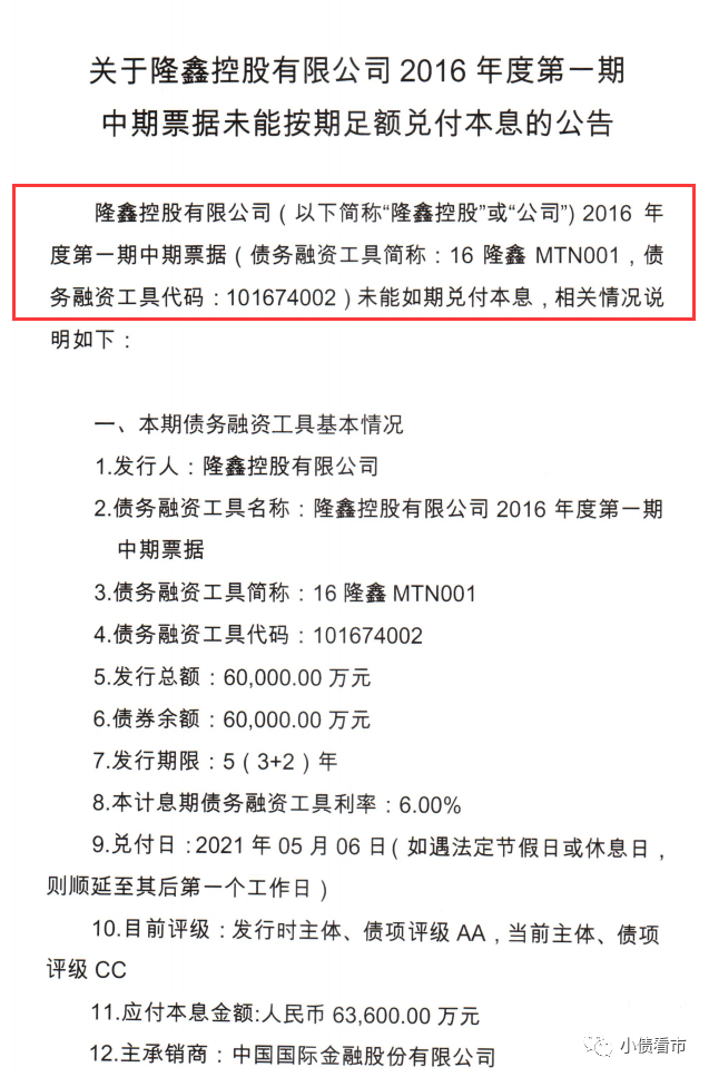 5月6日,隆鑫控股有限公司(以下簡稱“隆鑫控股”)公告稱,“16隆鑫MTN001”兌付日為5月6日,未能按期足額支付本息6.36億元,構成違約。