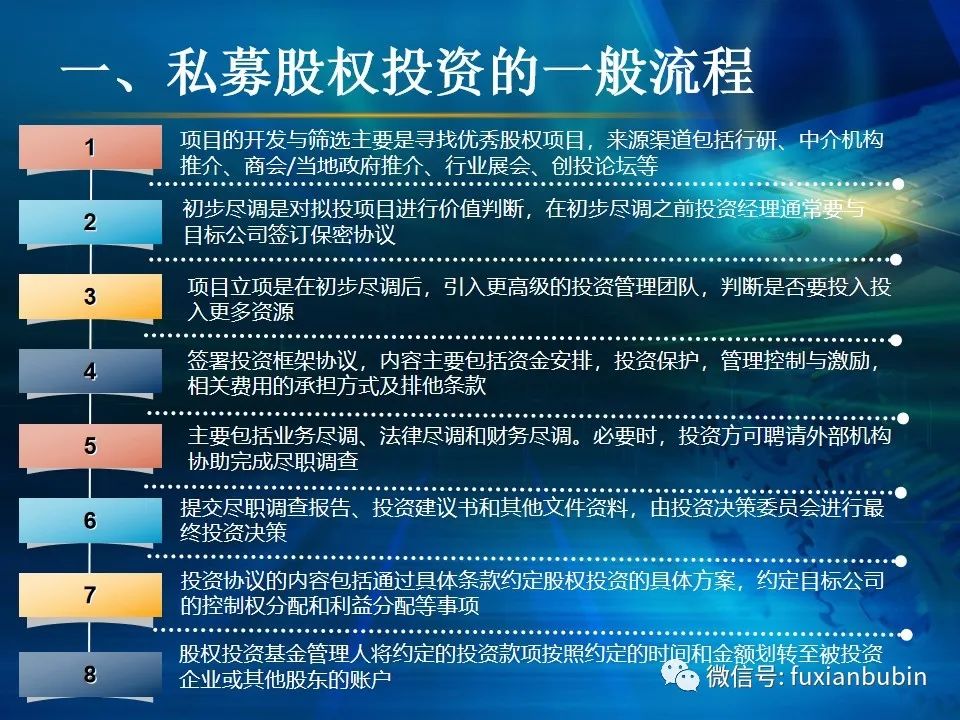 私募股權投資基金的投資工作,其業務流程主要圍繞投資決策開展,通常包括項目開發與篩選,初步盡職調查,項目立項、簽訂框架投資協議、盡職調查、投資決策、簽署投資協議、投資交割等主要環節。在這一過程中,財務盡調主要關注目標公司的歷史財務業績的情況,并對未來財務狀況進行合理預測。調查內容包括企業的歷史經營業績,未來盈利預測、營運資金、融資結構、資本性開支以及財務風險敏感度分析等。其作用在于為投資及整合方案設計、交易談判、投資決策提供支撐,進而判斷投資是否符合戰略目標及投資原則。法律盡職調查是對相關法律事務具有法律意義的背景資料進行應有的調查,使相關法律事務的處理建立在客觀、全面的信息基礎之上,以確保相關法律事務的處理能夠達到預期的結果,而不因相關信息在真實性、完整性、全面性、合法性等方面的原因影響預期目標的實現。經過財務盡調與法律盡調,在股權投資之前,需要考慮該項投資的性質、事實和背景,為之選擇恰當的估值方法,并結合市場參與者的假設,采用合理的市場數據和參數對目標公司進行估值,明確目標公司的公允價值。