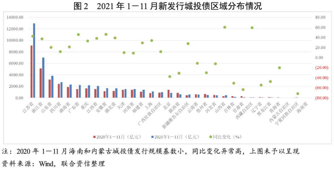 截至2021年11月底,存續城投債數量16254支,余額118871.47億元,較上年同期分別增長28.10%和21.25%。從區域分布看,截至2021年11月底,江蘇和浙江的存續城投債余額為萬億級,其中江蘇余額超過2.5萬億元,浙江余額超過1.5萬億元;山東、四川、湖南和重慶的存續城投債余額超過5000億元;海南、寧夏、內蒙古、黑龍江、青海、遼寧及西藏存續城投債余額不足100億元。