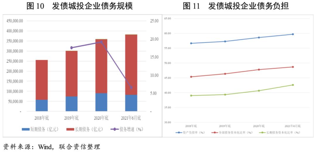 截至2021年6月底,發債城投企業有息債務規模超38萬億元;但隨著地方政府隱性債務監管及城投企業融資政策趨嚴,城投企業債務增速較之前年度明顯放緩。與此同時,隨著債務的逐步置換,短期債務占比下降至21.70%。從債務負擔來看,發債城投企業負債水平持續提升,債務負擔加重。