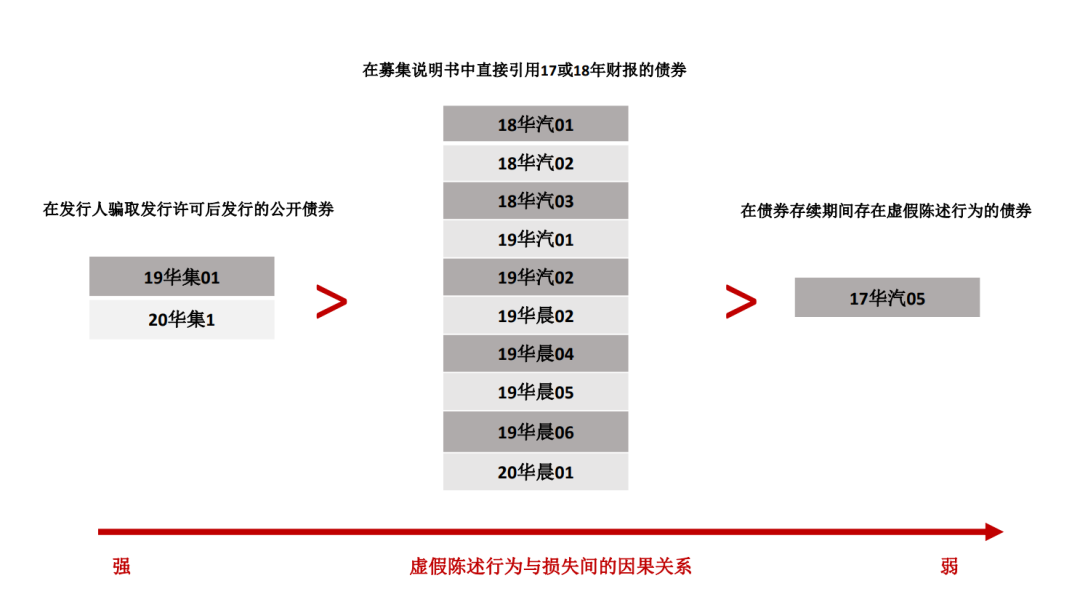 如何建立因果關系是一門學問, 而證監會認為的發行人涉嫌騙取獲得公開發行行政許可批復的違法違規行為直接為投資人確立了一條最為強有力的因果關系。對于發行在2019年8月8日之后的公開發行的19華集01、20華集1債券持有人而言, 其可直接主張“如果發行人如實披露了財務數據, 沒有財務造假, 發行人就無法獲得證監會的行政許可, 也不可能發行19華集01、20華集1債券; 那么投資人不可能買到該兩只債券, 當然不會有損失”。顯然該等因果關系是強于那些在募集說明書中引用虛假財務數據的債券, 例如20華晨01, 該等債券持有人仍需循規蹈矩地討論和論證發行人在募集說明書中的虛假陳述行為是如何影響其對發行人的償債能力的判斷。當然, 虛假陳述行為與損失間的因果關系最弱的, 當屬僅發生在債券受托管理期間的虛假陳述行為了。