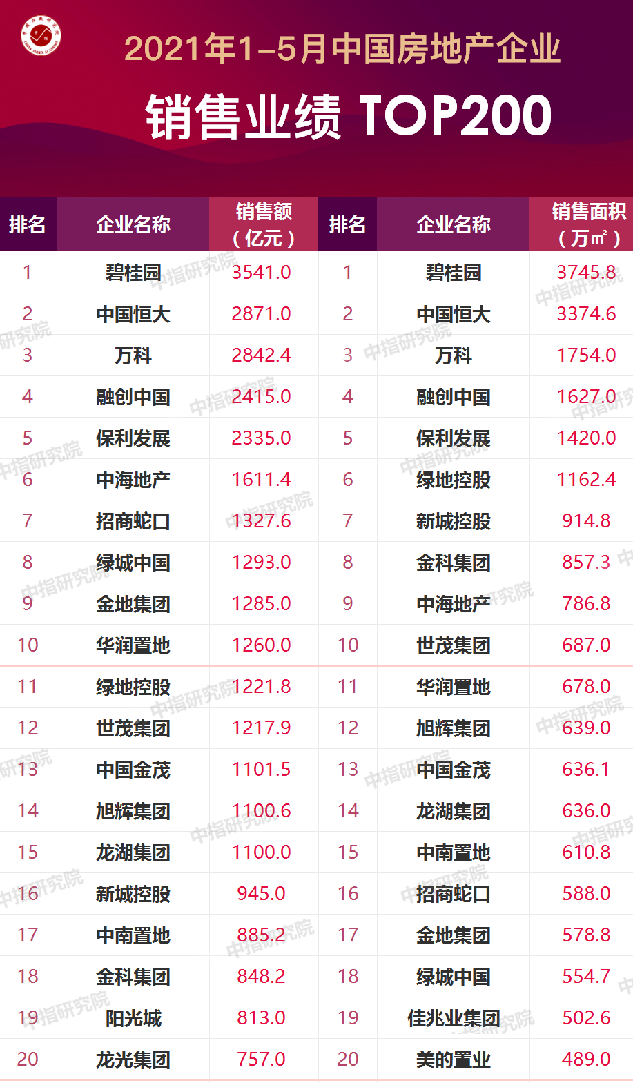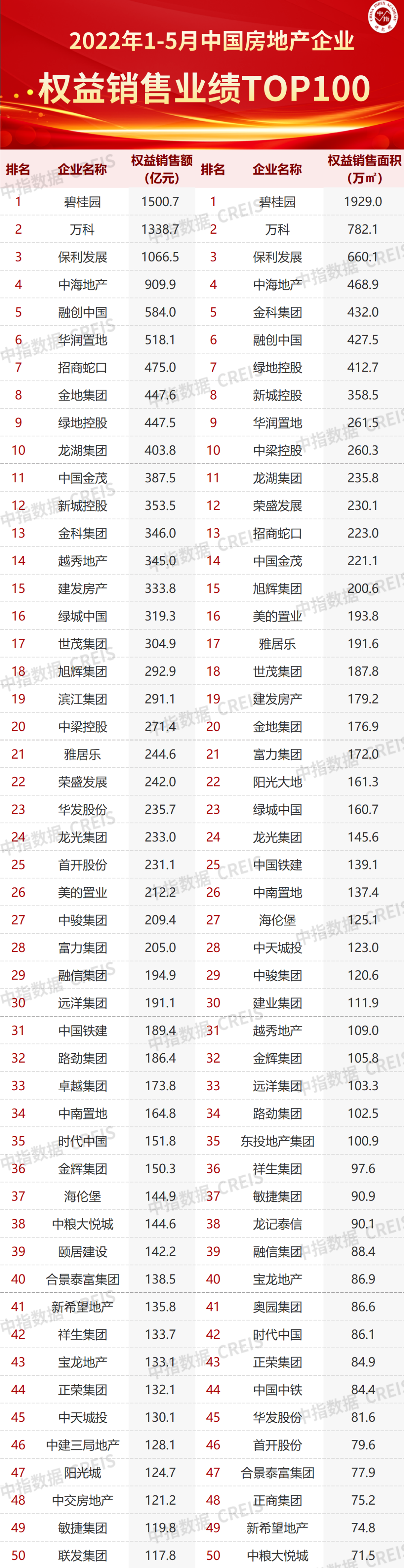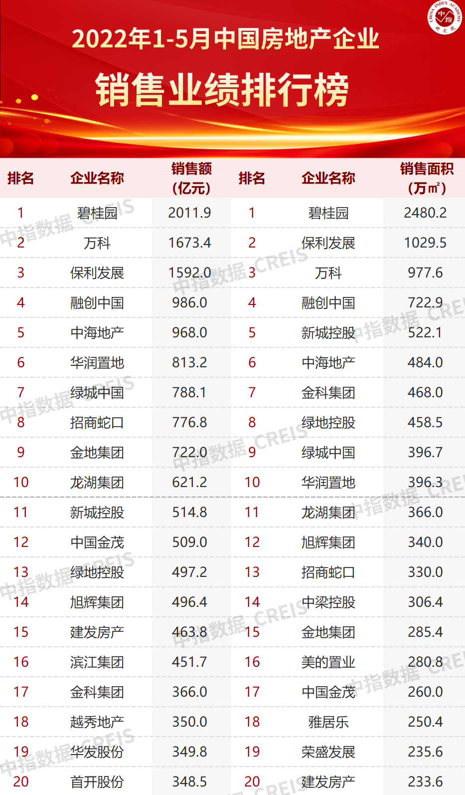2022年5月31日傍晚,中指研究院發(fā)布了“2022年1-5月中國(guó)房地產(chǎn)企業(yè)銷售排行榜”。