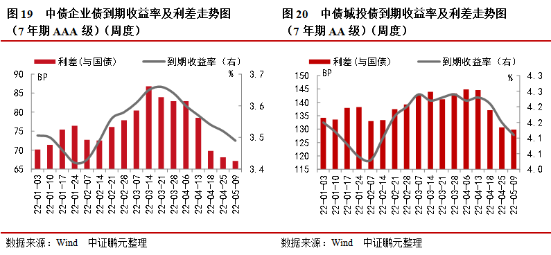 7年期AAA級(jí)別企業(yè)債上周平均到期收益率為3.49%,較前一周下行3.00BP;與同期限國債平均利差為67.15BP,較前一周收窄0.97BP。7年期AA級(jí)別城投債上周平均到期收益率為4.11%,較前一周下行4.00BP;與同期限國債平均利差為129.85BP,較前一周收窄0.82BP。