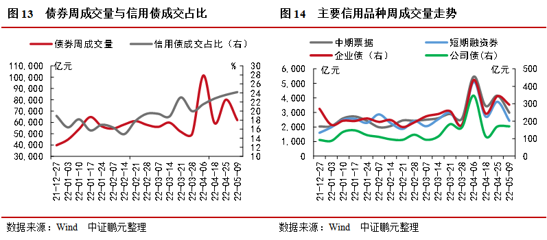 債券成交量較前一周下降22.65%,信用債成交占比為24.20%,較前一周上升0.60%;