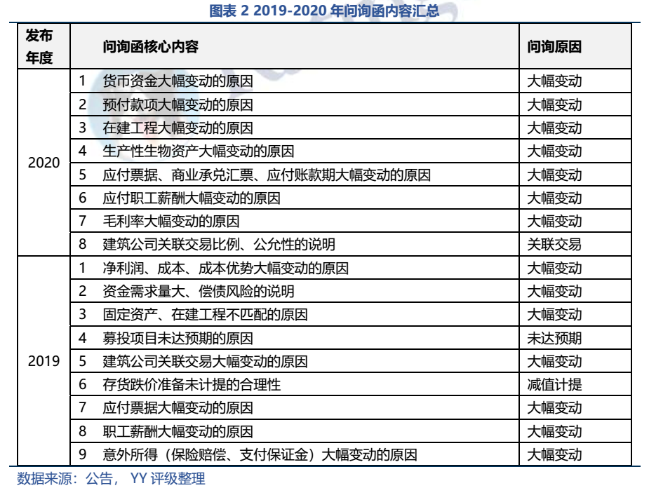 19、20年所發的問詢函主要針對變動較大的科目進行詢問,如貨幣資金、預付款項、在建工程等,所詢問的內容具有普遍性、浮于表面,猶如蜻蜓點水,更多的是例行公事、“我就隨便問問,你看著解釋”的態度。