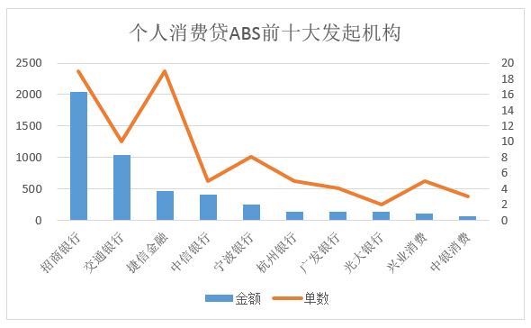 再來看個人消費貸ABS,個人消費貸ABS的發行機構主要為商業銀行及持牌消費金融機構,前十大發行機構如上圖所示。