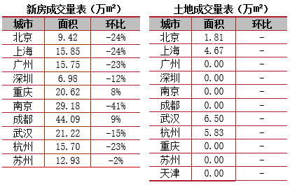 一線城市:四城成交環比均有所回落,其中,北京、上海、廣州降幅都在20%左右,深圳環比小幅回落,下降12%。