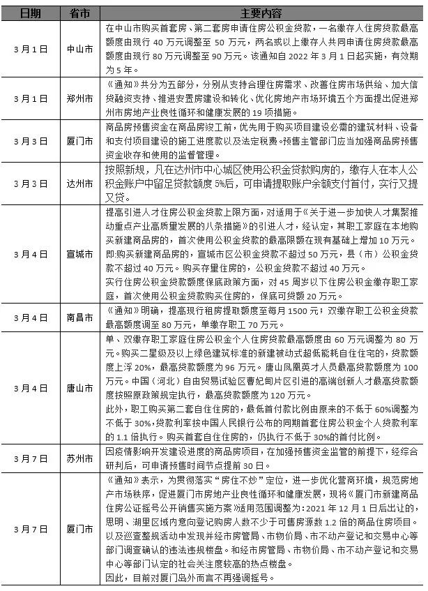 地方層面,鄭州出臺19條新政,放寬限購、取消認房又認貸、推行棚改貨幣化安置。蘇州允許受影響企業提前申請預售證。南昌、唐山、宣城、達州、中山等放寬公積金貸款,譬如唐山將公積金公積金貸款額度提至80萬元,二套房首付比降至30%等。