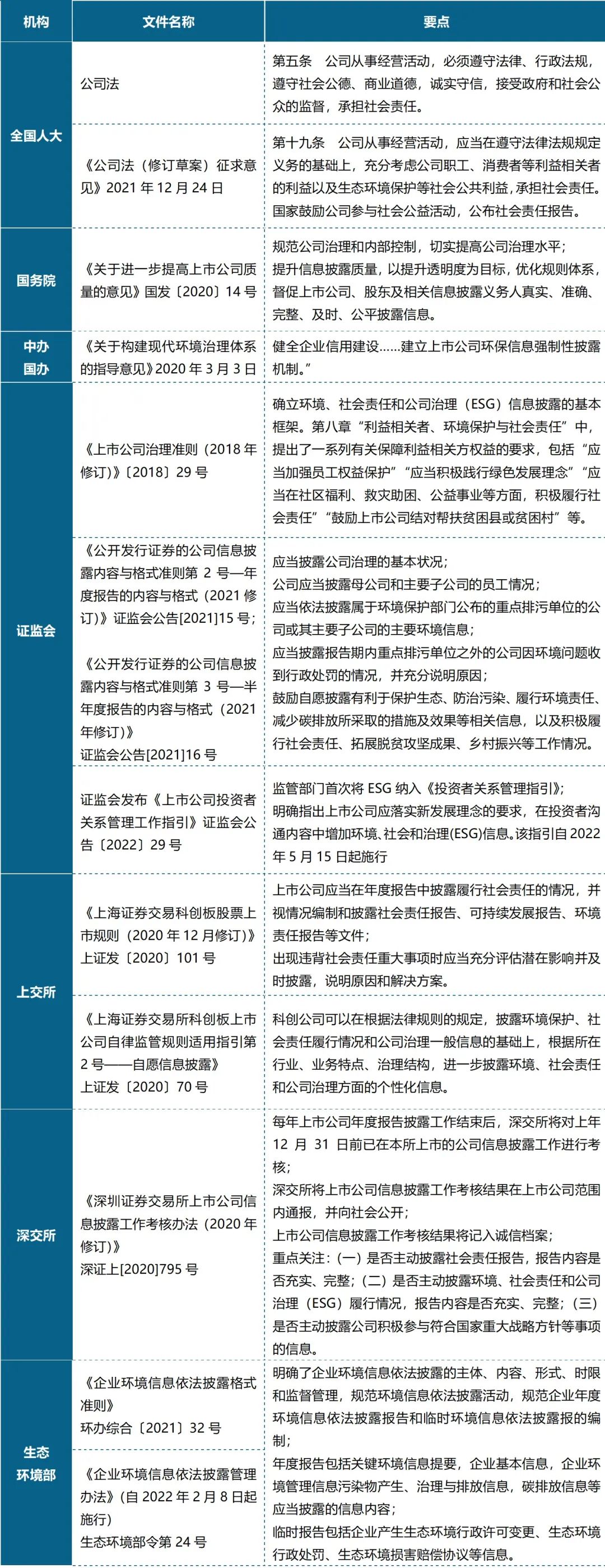 需要注意的是,除了滬深交易所及證監會的要求,上市公司在從事融資活動(如綠色信貸、發行綠色債券)時,可能同樣面臨環境、社會責任的報告義務。