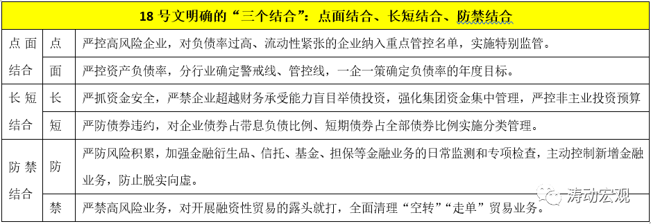 (二)考慮到3號(hào)文延續(xù)了《關(guān)于國有企業(yè)資產(chǎn)負(fù)債約束的指導(dǎo)意見》的要求和精神,基本上可以被視為是18號(hào)文的配套細(xì)則,因此3號(hào)文的適用性亦可以進(jìn)一步推廣到河南省以外的地區(qū)。因此18號(hào)擬定的一些原則仍然值得關(guān)注,如下表所呈現(xiàn)的“三個(gè)結(jié)合”。