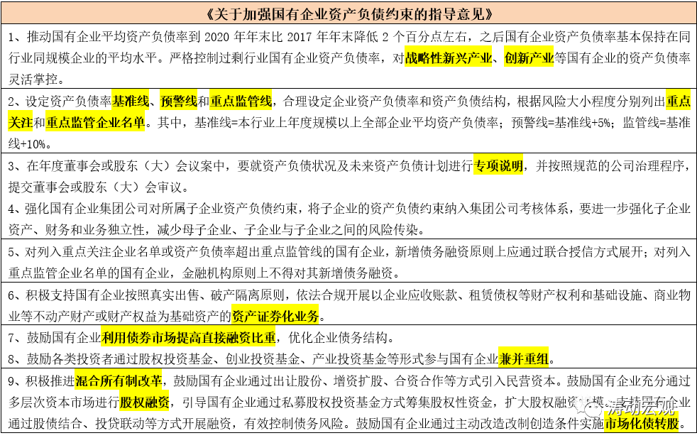 2018年9月13日,中共中央辦公廳和國務(wù)院辦公廳聯(lián)合印發(fā)《關(guān)于加強(qiáng)國有企業(yè)資產(chǎn)負(fù)債約束的指導(dǎo)意見》,將所有行業(yè)、所有類型國有企業(yè)納入資產(chǎn)負(fù)債約束管理體制,并提出了一系列要求,特別是3號(hào)文的很多規(guī)定基本上和《關(guān)于加強(qiáng)國有企業(yè)資產(chǎn)負(fù)債約束的指導(dǎo)意見》相一致,這里不再贅述(詳見下表)。