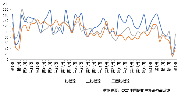 2022年第7周成交低位回升。一線城市成交指數(shù)為53.22,環(huán)比增長30.76點;二線城市成交指數(shù)為41.82,環(huán)比增長30.00點;三四線城市成交指數(shù)為92.07,環(huán)比增長79.19點。