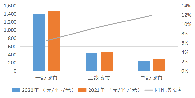 2021年,工業(yè)用地成交均價較2020年整體上漲。1~12月,一、二、三線城市工業(yè)用地成交均價分別為1471.27元/平方米、472.4元/平方米、281.17元/平方米,較2020年同比分別增長6.46%、9.41%、11.86%。
