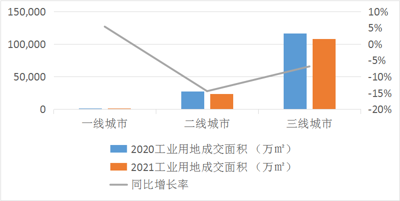 2021年,全國工業(yè)用地總成交面積為133,512.71萬平方米,相較于2020年減少8.19%。一、二、三線城市工業(yè)用地總成交面積分別為1,638.64萬平方米、23,648.62萬平方米、108,225.45萬平方米,較2020年同期增長率分別為5.36%、-14.49%、-6.87%。